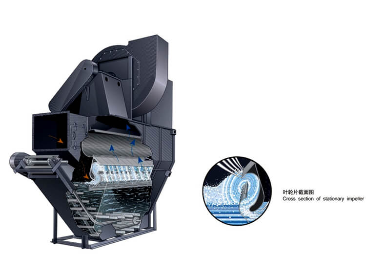 在風機風動力的作用下,高速氣流在狹窄通道內(nèi)呈S形軌跡運動的沖激力,強化粉塵在水洗作用下的濕潤、凝并和沉降功能。含塵氣體由入口進入除塵器,氣流轉(zhuǎn)彎向向沖擊水面,部分較大的塵粒落入水中。當含塵氣體以18-35/秒的速度通過上、下葉片間的“S”形通道時,激起大量的水花,使水氣充分接觸,絕大部分微細的塵粒混入水中,使含塵氣體得以充分凈化,經(jīng)由“S”形通道后,由于離心力的作用,獲得塵粒的水又返回漏斗。凈化后的氣體由分霧室擋水板除掉水滴后經(jīng)凈氣出口和通風機排出除塵機組,泥漿則由漏斗的排漿閥連續(xù)或定期的排出。新水則有供水管路補充。機組內(nèi)的水位由溢流箱控制。當水位高出溢流箱的溢流堰時,水便流進水封并由溢流管排出。設(shè)在溢流箱蓋上的水位自動控制裝置能保證水面在3-10毫米的范圍內(nèi)變動,從而保證機組穩(wěn)定的高效率和節(jié)約用水。溢流箱上部用通氣管與凈氣分霧室連通,使兩者具有相同高度的水面。溢流箱的水是通過插入除塵器下部的連通管連通的,以保持溢流箱水面平穩(wěn)。