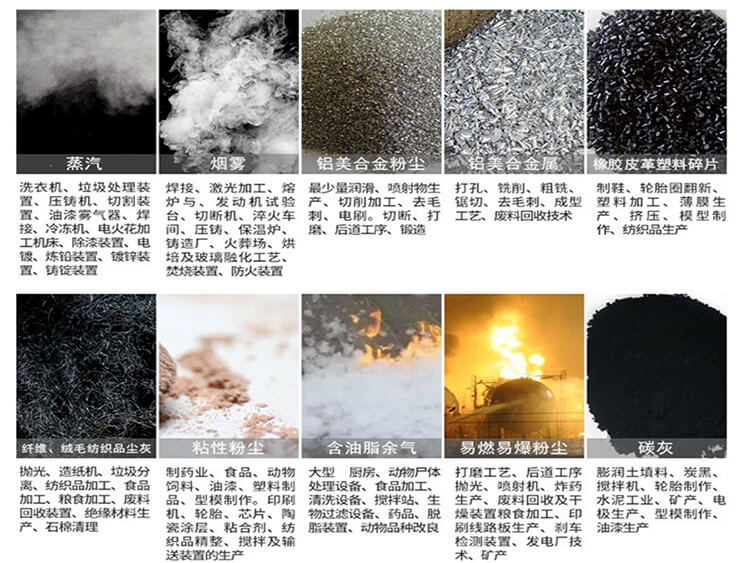 鋁鎂金屬材料打磨工序、易燃易爆的的工序、具有黏結(jié)性的潮濕煙塵氣體。